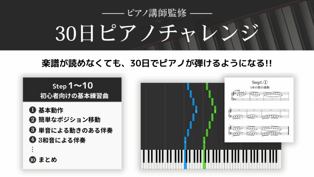 「30日ピアノチャレンジ」は、1〜10のステップで構成されていて、毎日少しずつ進めることで、着実にステップアップすることができます。
