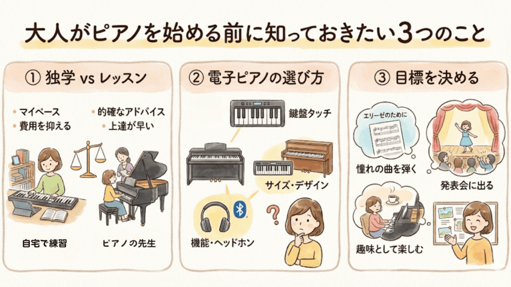 ピアノをスタートする際、最初に迷うのが環境や手段です。まずはここを整理しましょう。