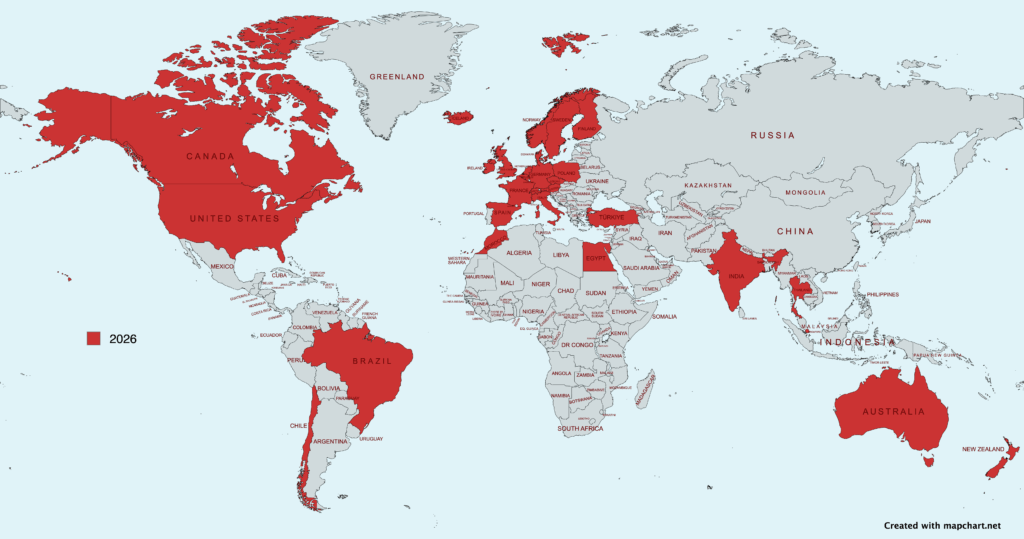 Australia, Austria, Belgium, Canada, Denmark, Finland, France, Germany, Iceland, Ireland, Italy, Netherlands, New Zealand, Norway, Poland, Spain, Sweden, Switzerland, United Kingdom, United States, India, Singapore, Thailand, Czech Republic, Chile, Turkey, Brazil, Egypt, Morocco.