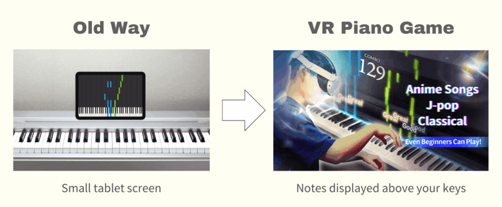 Nous avons développé « Sigure », un jeu de piano en réalité virtuelle qui te permet de jouer facilement tes chansons japonaises préférées – comme si c’était un jeu !