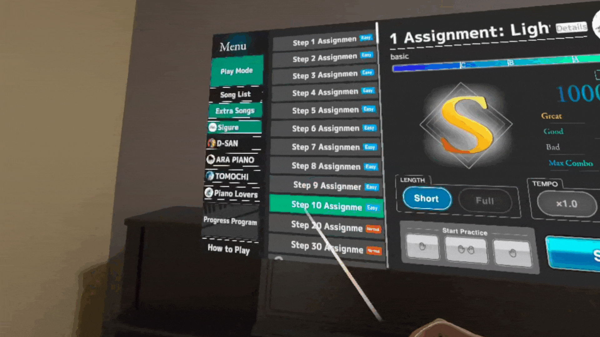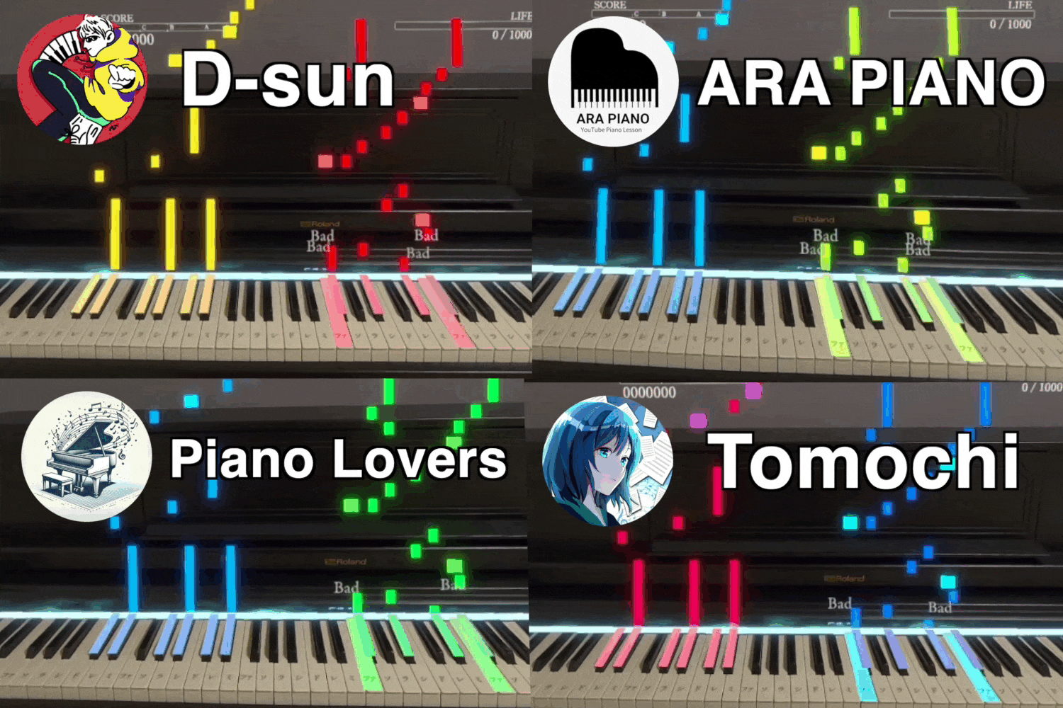 Play the piano in time with the note bars, and earn points based on Bad/Good/Great and your combo count.