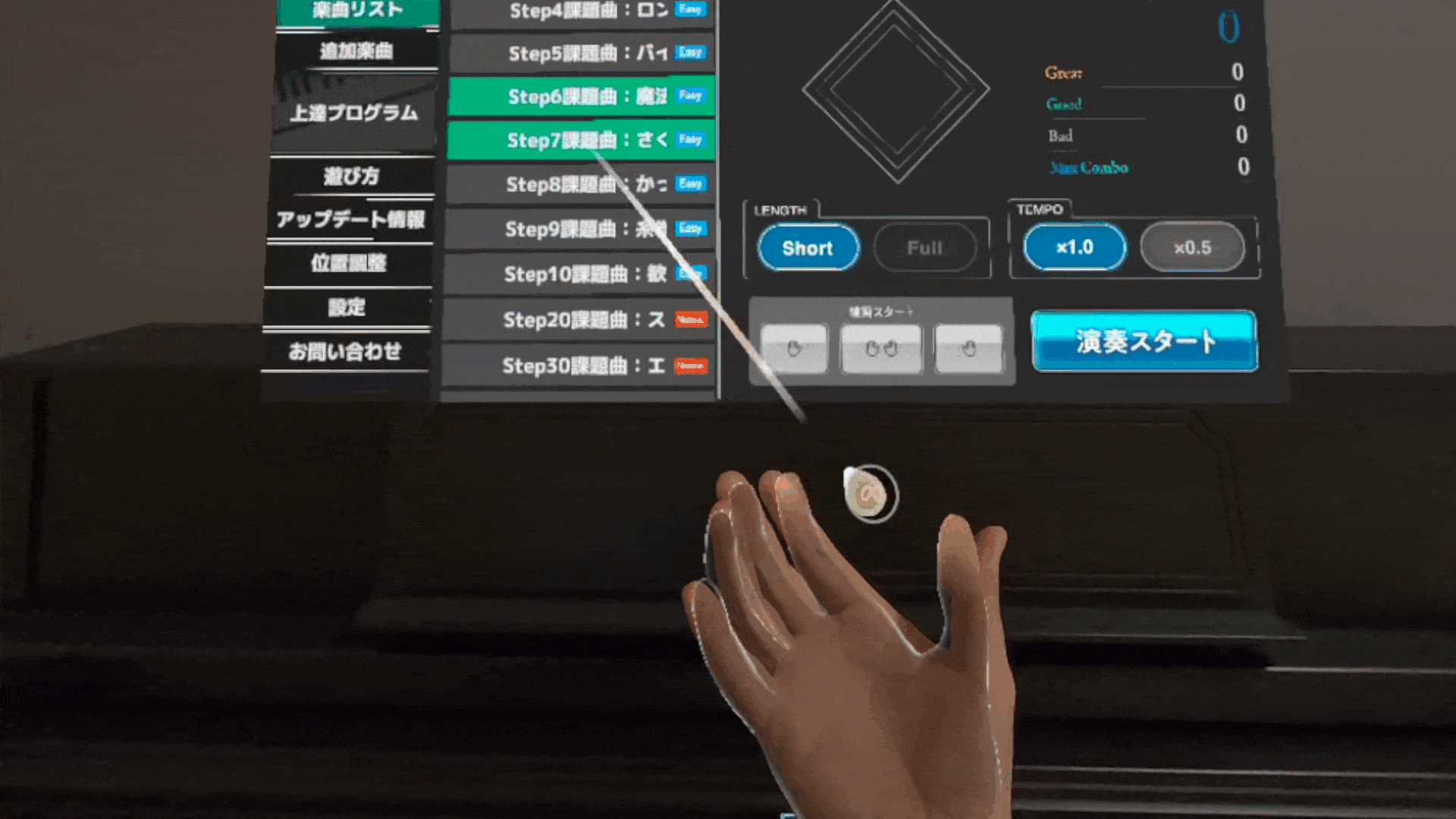 通常、Meta Questのマイクはピアノの音を拾いませんが、設定画面でピアノの音の出力を「VRゴーグル」にすると、ピアノの音も録音できます。