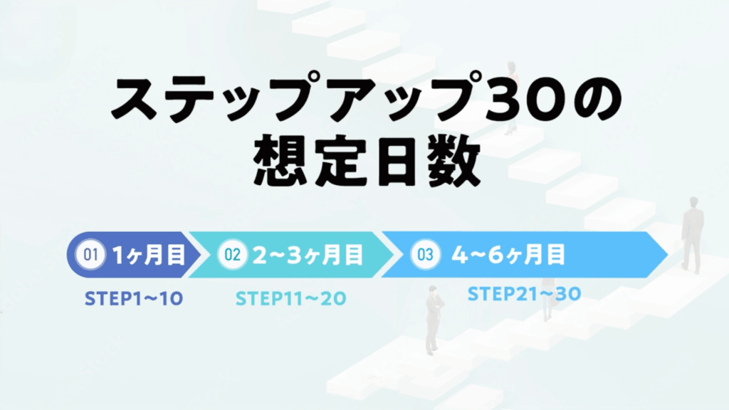 ステップアップ30にかかる日数は人によりますので、3ヶ月で全て終わる方もいれば、半年、1年かかる方もいるかもしれません。