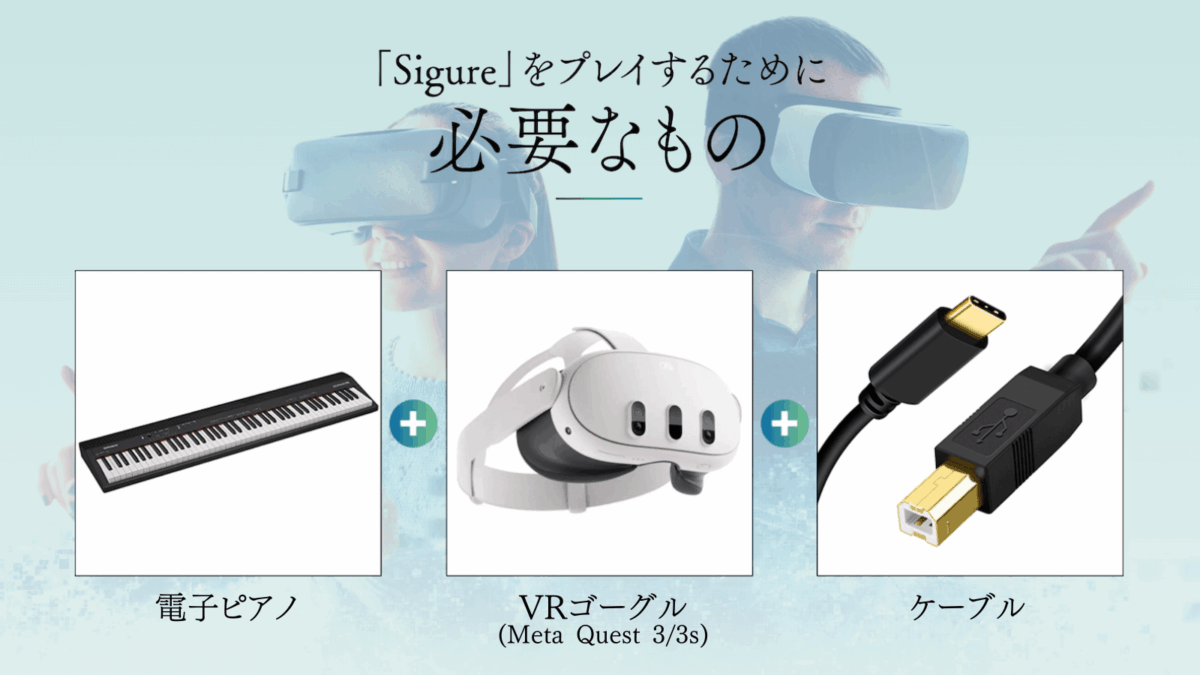 「VRゴーグル」「電子ピアノ」「ケーブル」をご用意いただき、Sigureを楽しんでいただければと思います。